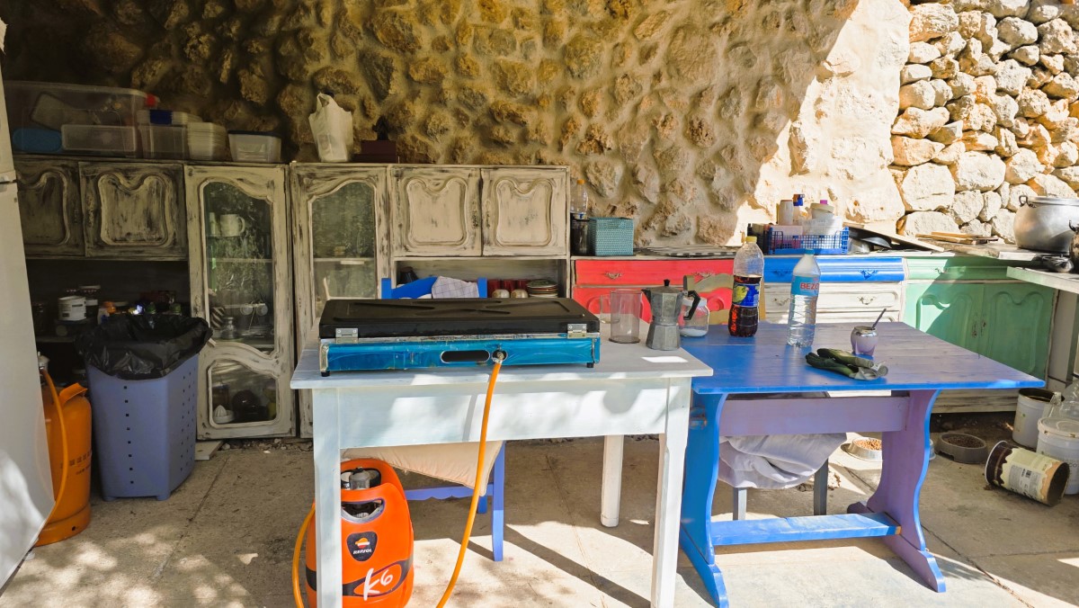 - Cocina exterior bajo porche contiguo. Dispone de nevera de gas nueva y cocina de 3 fuegos de camping.
